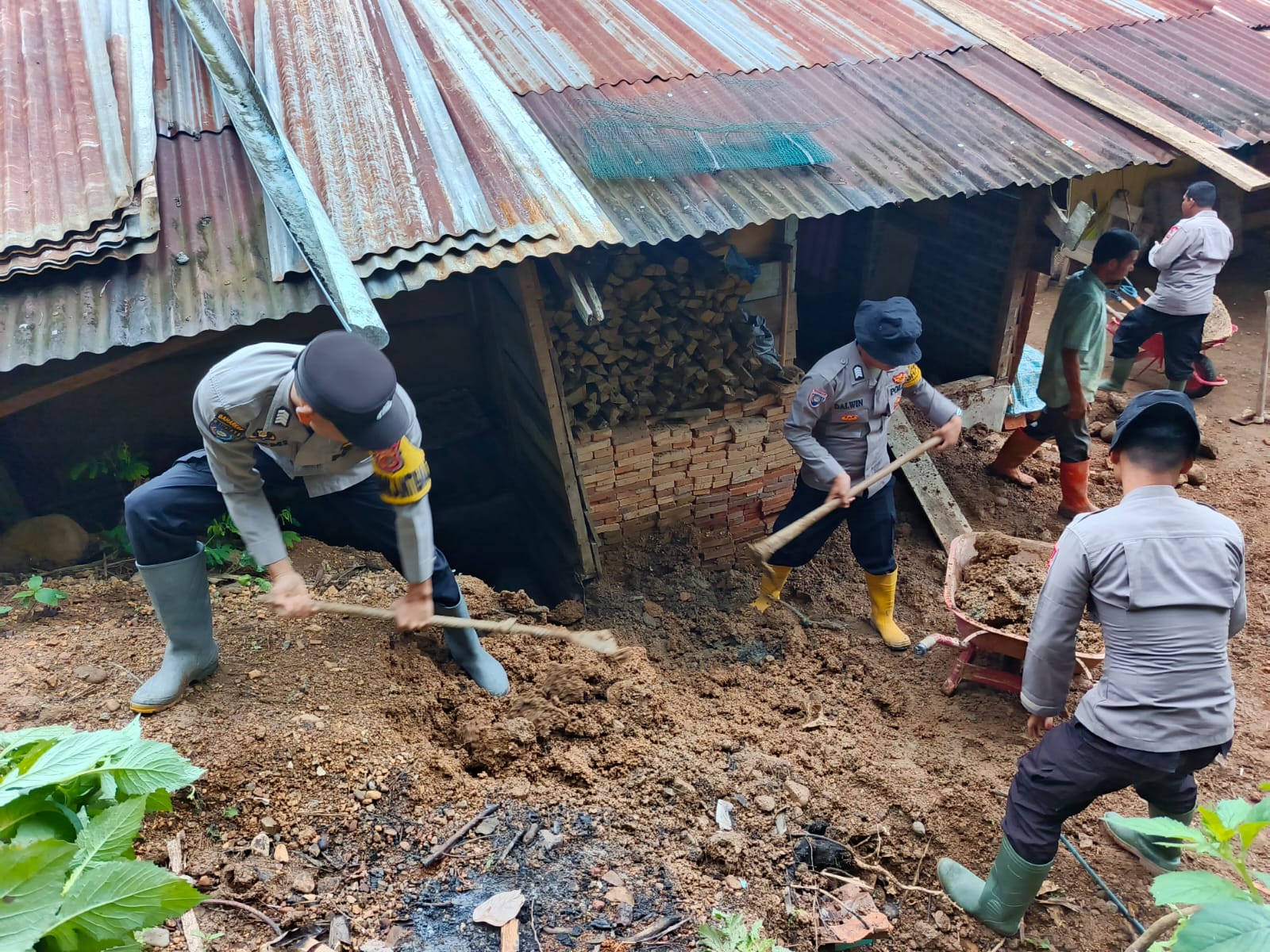 Di Kecamatan Rusip Antara, personel Polsubsektor Rusip Antara bersama BKO Brimob Polda Aceh melakukan pembersihan material longsor di salah satu rumah warga Kampung Atu Singkih. Material tanah yang menimbun halaman rumah dibersihkan secara manual agar rumah kembali dapat difungsikan.