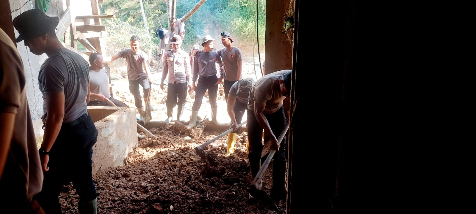 Sebanyak 20 personel gabungan dari Polsubsektor Rusip Antara dan BKO Brimob Polda Aceh diterjunkan untuk membantu proses pembersihan. Dengan menggunakan peralatan manual, para personel bahu-membahu mengangkat tanah dan kayu yang mengendap di bagian belakang rumah.