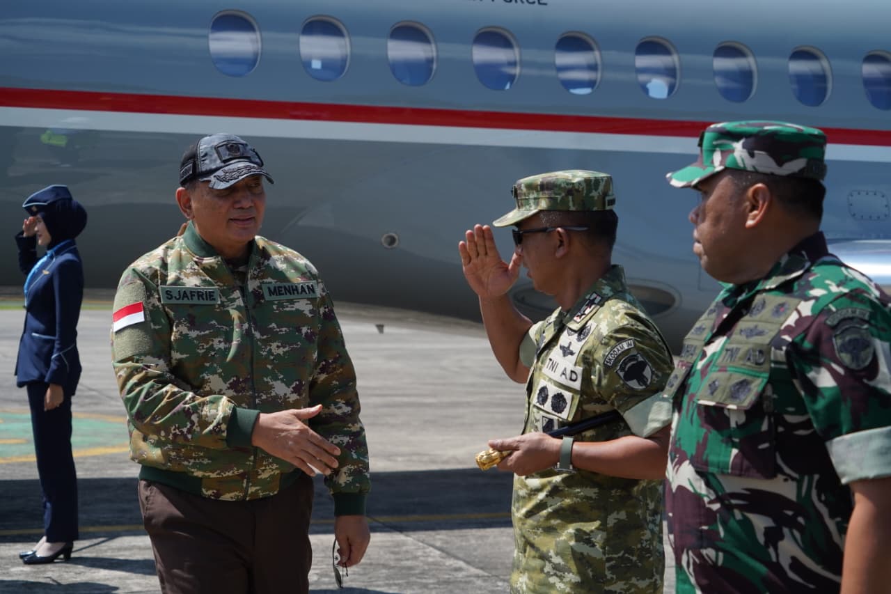 KSNNews.id|Banda Aceh — Panglima Komando Daerah Militer Iskandar Muda (Pangdam IM), Mayor Jenderal TNI Joko Hadi Susilo, S.I.P., menyambut kedatangan Menteri Pertahanan Republik Indonesia, Jenderal TNI (Purn) Sjafrie Sjamsoeddin, bersama Panglima TNI, Jenderal TNI Agus Subiyanto, saat tiba di Lanud Sultan Iskandar Muda pada Sabtu (29/11/25). Kehadiran Menteri Pertahanan tersebut memperlihatkan komitmen kuat Pemerintah Pusat dalam memberikan dukungan langsung bagi masyarakat Aceh yang sedang menghadapi bencana banjir dan longsor di sejumlah wilayah.
