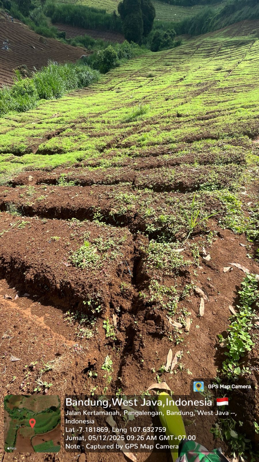 Di wilayah Pangalengan, lahan yang sebelumnya merupakan area perkebunan teh diketahui banyak dialihfungsikan menjadi lahan penanaman kentang yang dikelola oleh petani binaan Sabani Farm. Aktivitas tersebut dilaporkan telah menimbulkan tanda-tanda retakan atau belahan tanah di sejumlah titik, yang mengindikasikan adanya pergerakan tanah dan potensi longsor apabila tidak segera ditangani secara serius.