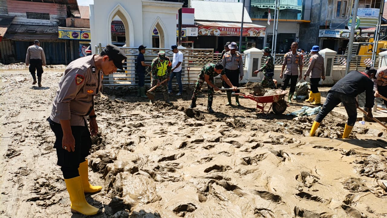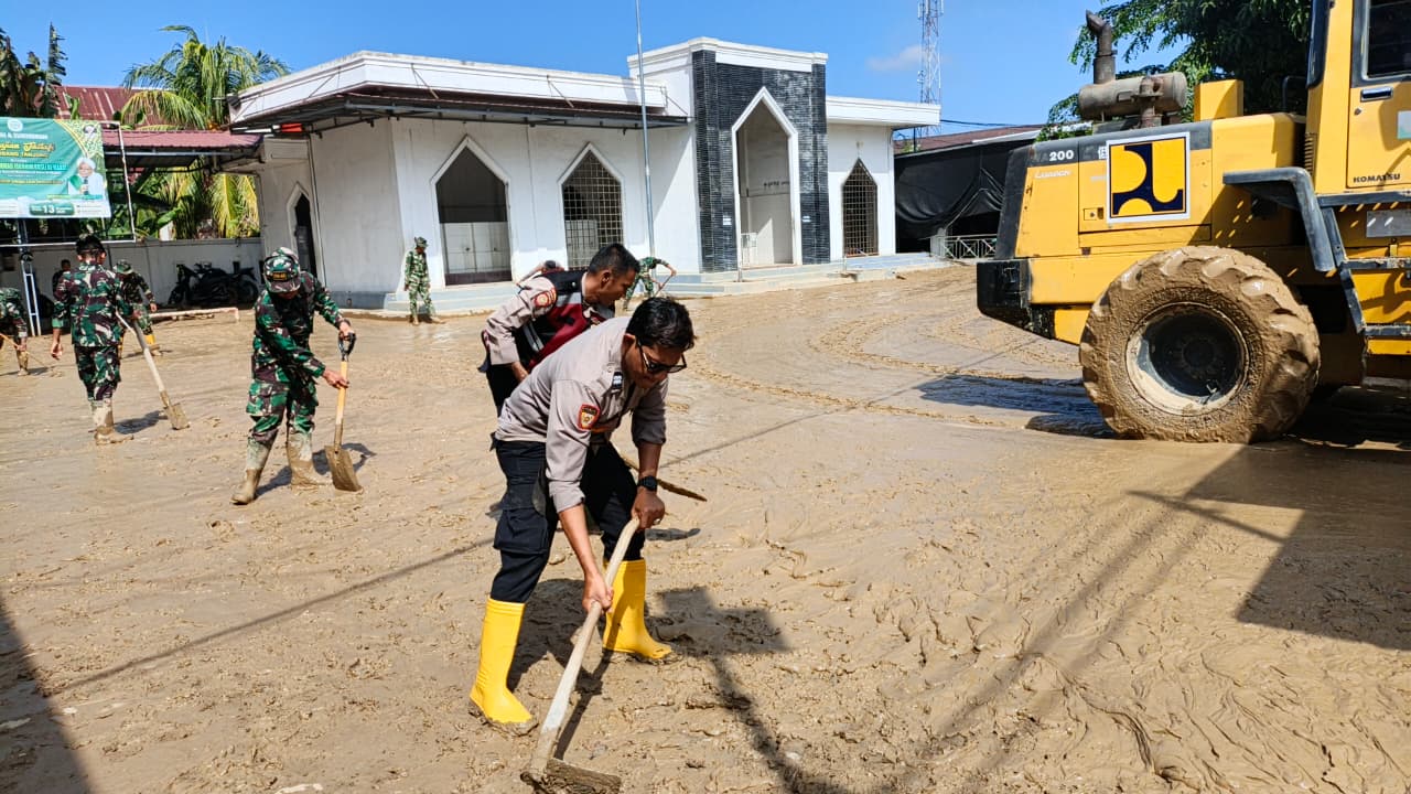 Pembersihan dimulai dengan pengangkatan lumpur tebal yang memenuhi halaman dan area sekitar masjid. Personel Polri dan TNI tampak bekerja menggunakan sekop dan cangkul, sementara warga setempat juga ikut terlibat aktif sehingga proses gotong royong berlangsung cepat dan efektif