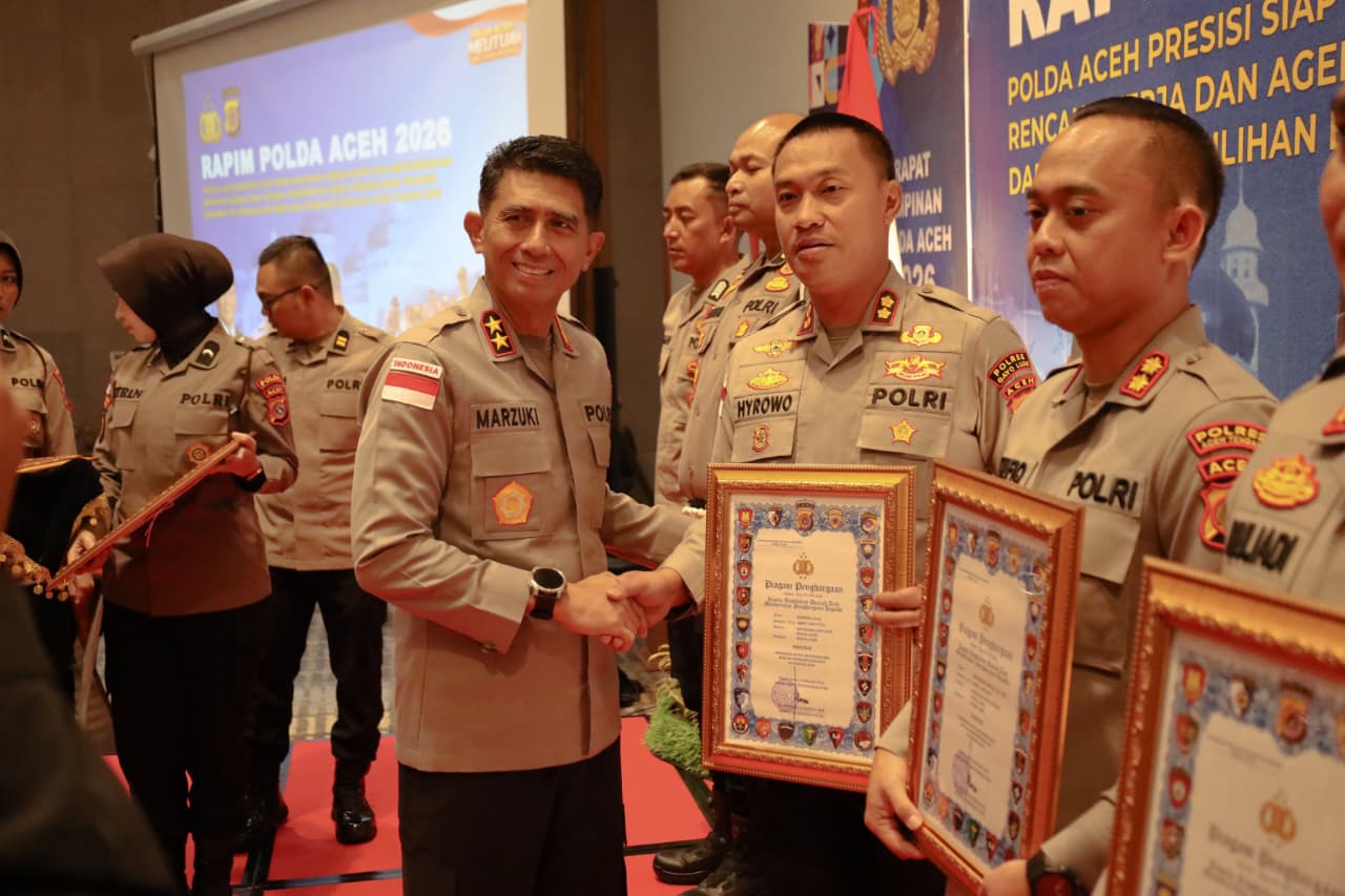 Kapolda Aceh dalam rangkaian kegiatan Rapim Polda Aceh 2026, memberikan penghargaan kepada personel Polri, mahasiswa STIK Lemdiklat Polri, serta elemen masyarakat yang berkontribusi aktif dalam penanganan bencana di Provinsi Aceh.