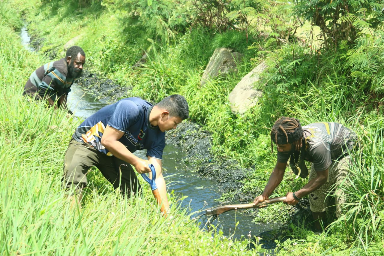 KSNNews.id|Puncak Jaya – Dalam rangka menjaga kondisi lingkungan supaya selalu terlihat bersih dan rapi, Satgas Pamtas RI-PNG Yonif 112/DJ Pos Kota Baru bersama warga gelar gotong royong di Kampung Pagaleme Distrik Mulia Kab. Puncak Jaya Prov. Papua Tengah, Selasa (09/12/2025).